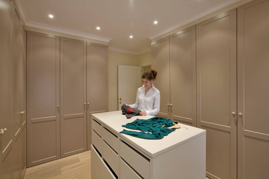 Voor de slaapkamerkast werd de volledige breedte van de kamer benut. Om het landelijke karakter van de woning te benadrukken zorgden we ervoor dat het plafond met de typische landelijke omlijsting in het zicht bleef. Enkele accessoires, zoals een garderobelift zorgen ervoor dat de kast ten volle benut wordt. Ook in de gesloten dressing kozen de bewoners er bewust voor om de kasten net niet kamerhoog te maken, zodat de plafondomlijsting zichtbaar bleef. Voor de afwerking van de landelijke draaideuren kozen de bewoners voor een kaderdeur met een bijpassende deurgreep.