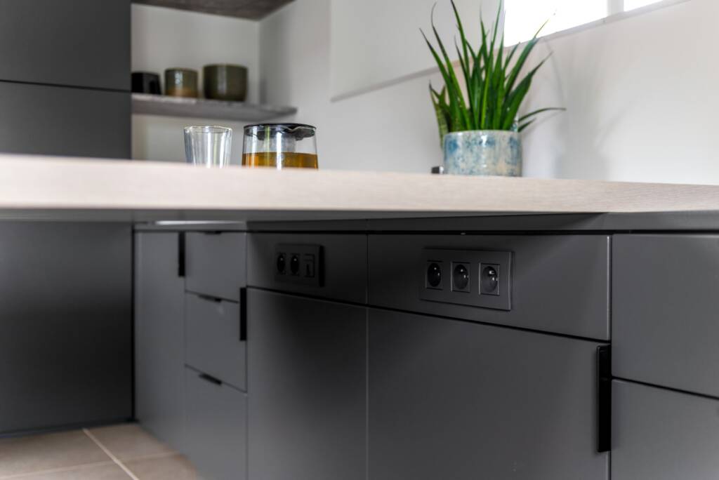 Deze klant integreerde een modern zwart bureau onder het schuin dak van zijn woning. Zo kreeg hij de perfecte home office om van thuis uit te werken. We zorgden voor een zee aan opbergruimte met de afgeschuinde bureaukasten. De bewoners kozen voor een moderne look met zwarte kasten en een fijne bijpassende handgreep. Een warme en gezellige touch werd toegevoegd met het werkblad in houtstructuur. Onder het werkblad werden de stopcontacten netjes weggewerkt in de bureaukast.